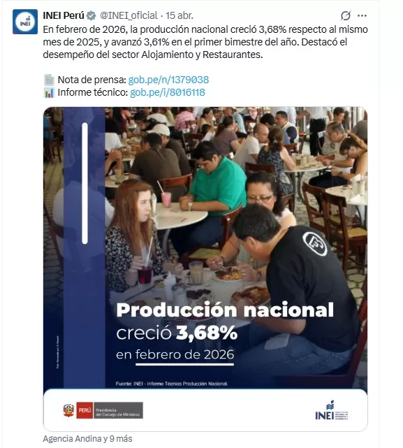 El Instituto Nacional de Estadística e Informática (INEI) informó que la producción nacional registró un crecimiento de 3.68 % en febrero de 2026. Este resultado superó las proyecciones de analistas privados, quienes estimaban una expansión cercana al 3 % para el segundo mes del año.