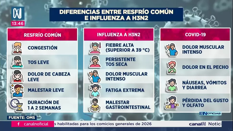 La influenza A H3N2 es un subtipo común de la gripe estacional y suele confundirse con el resfriado común o el COVID-19 debido a la similitud de síntomas. Sin embargo, la Organización Mundial de la Salud (OMS) advierte que no es posible distinguir con certeza entre estas enfermedades sin un diagnóstico clínico específico mediante pruebas de laboratorio, como pruebas rápidas o PCR.
