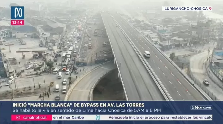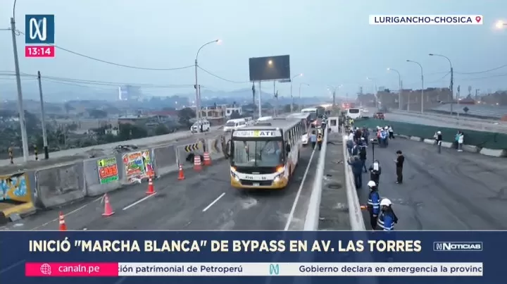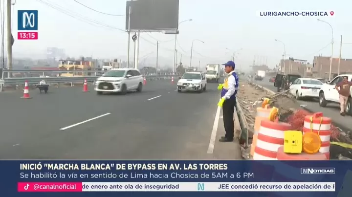 Este viernes 9 de enero inició la marcha blanca del bypass Las Torres en el distrito de Lurigancho-Chosica. La Empresa Municipal de Apoyo a Proyectos Estratégicos (Emape) habilitó dos carriles en el sentido de Lima hacia Chosica, como parte de una primera etapa que permitirá aliviar el tránsito vehicular en la autopista Ramiro Prialé. El horario de operación provisional será únicamente durante el día, de 5:00 a.m. a 6:00 p.m., debido a problemas de iluminación que se solucionarán en un plazo aproximado de dos semanas.
