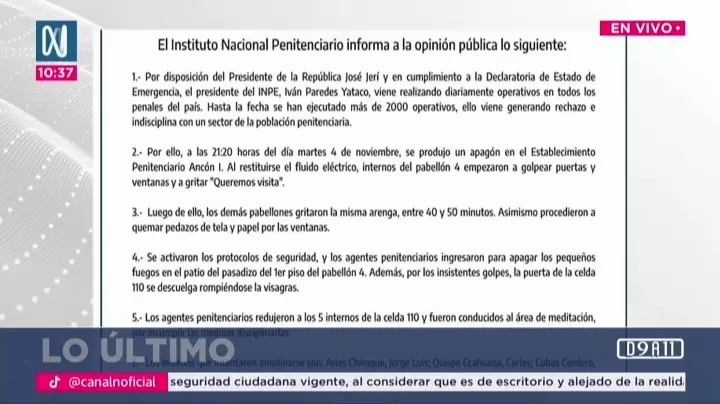 El Instituto Nacional Penitenciario (INPE) informó que agentes penitenciarios lograron controlar un intento de motín en el penal Ancón I, registrado la noche del martes 4 de noviembre. Los hechos se originaron a las 9:20 p.m., tras un apagón general en el establecimiento penitenciario.