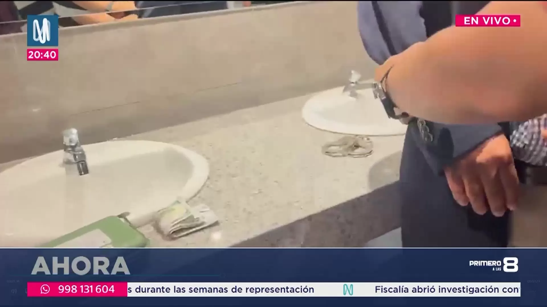 Durante la intervención, un policía le señala al fiscal las razones del operativo. El fiscal extrae de su bolsillo interior un fajo de billetes que, según se observa, son dólares estadounidenses. Los billetes son colocados en el lavadero mientras otro agente solicita “el cotejo, una foto”.