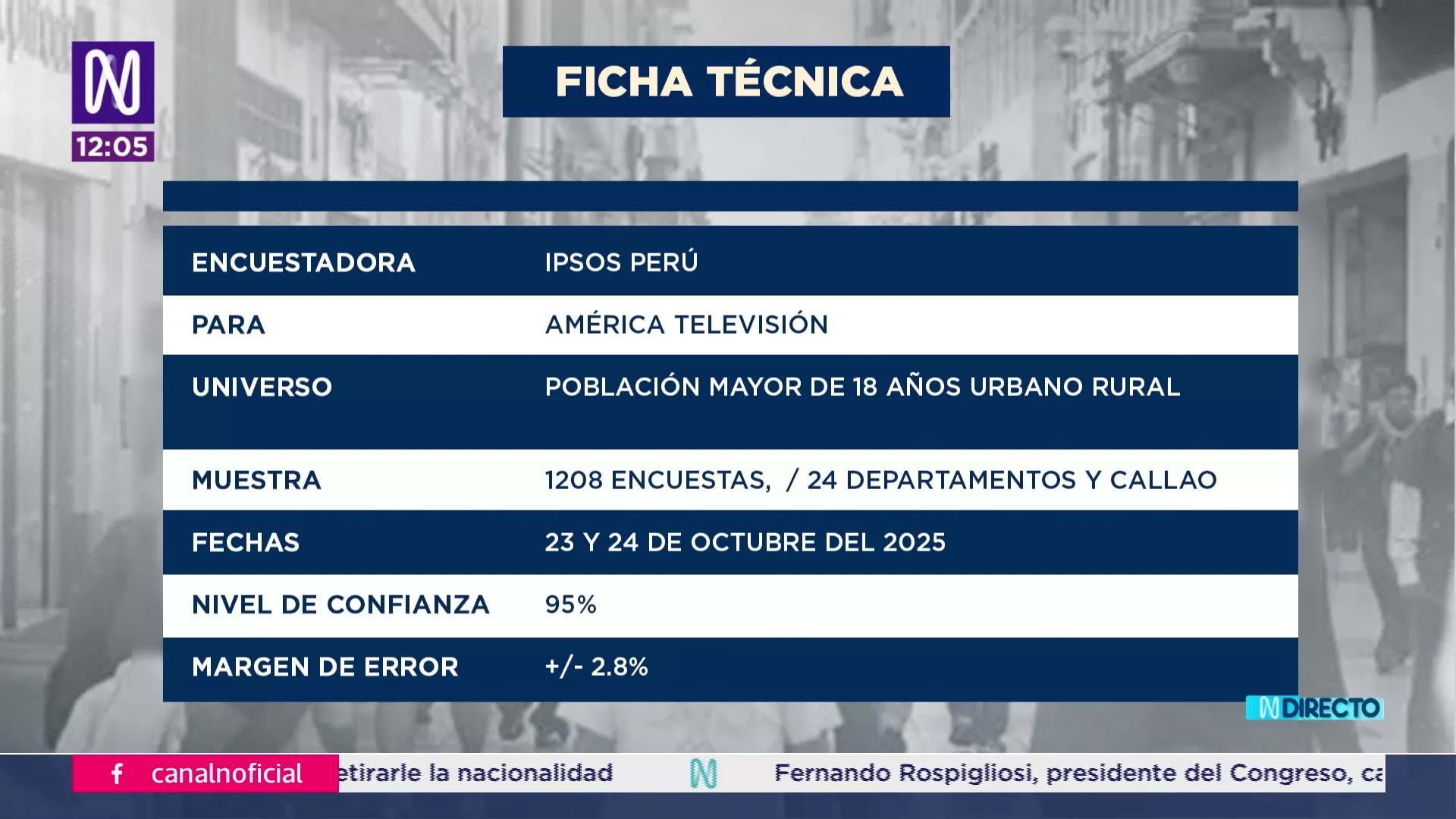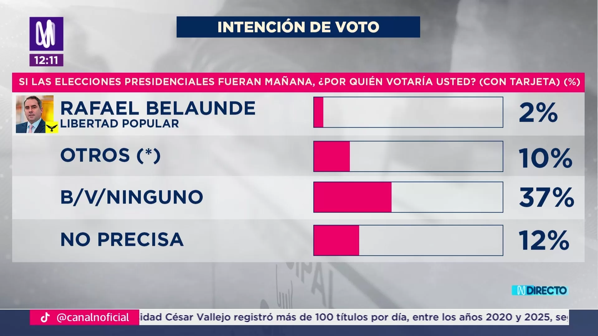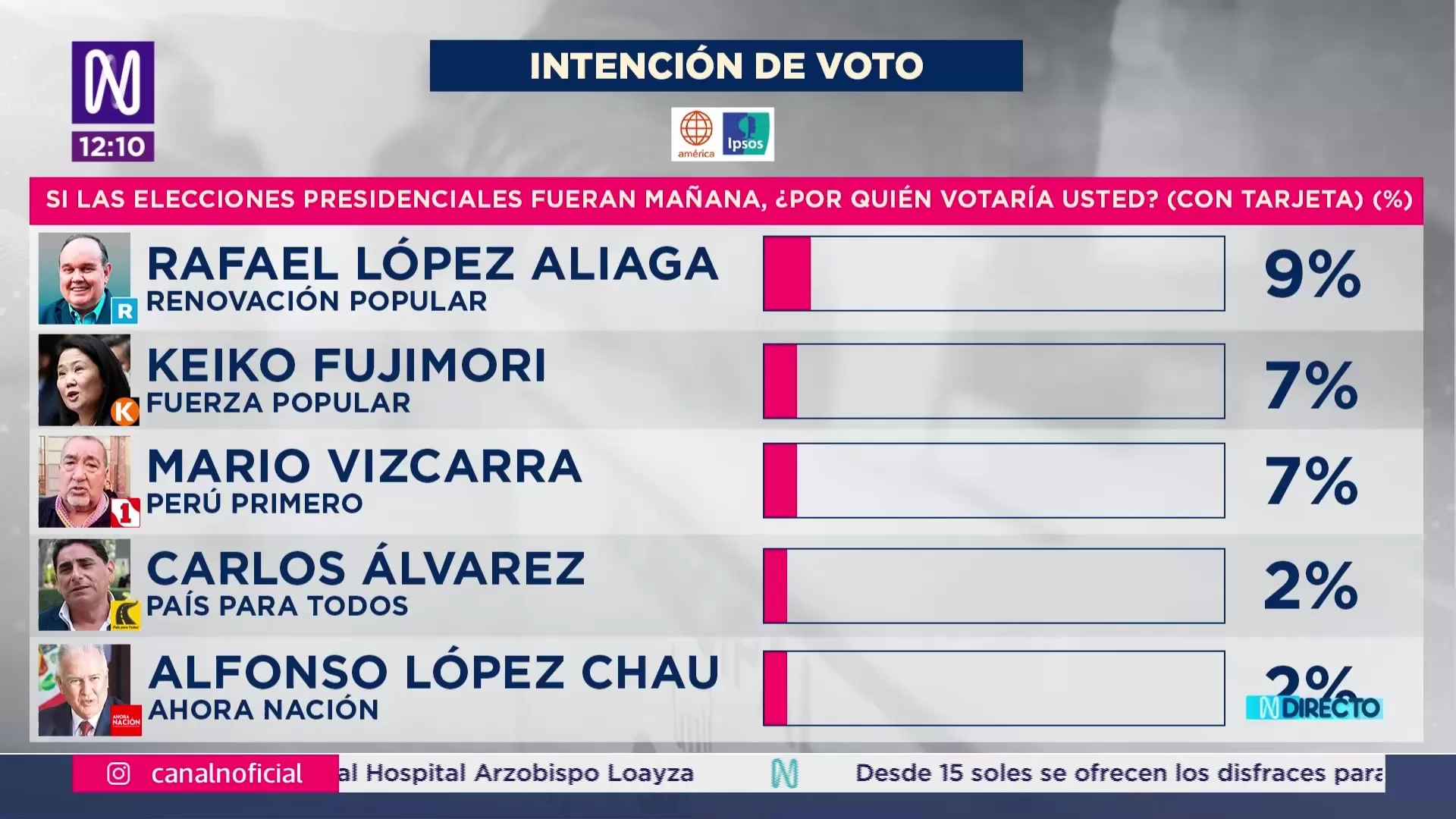 La última encuesta de Ipsos para América Televisión ubica a Rafael López Aliaga en primer lugar de intención de voto presidencial con 9%, seguido por Keiko Fujimori y Mario Vizcarra con 7%. Carlos Álvarez alcanza 4%, y otros aspirantes como López Chau, Espá, Lescano, Acuña, Butters, García Belaunde y Rafael Belaunde marcan 2%. Un 10% se reparte entre otros precandidatos. El voto en blanco o nulo registra 37%, mientras que un 12% no precisa su preferencia. El estudio fue realizado entre el 23 y 24 de octubre a nivel nacional con un margen de error de ±2,8%.
