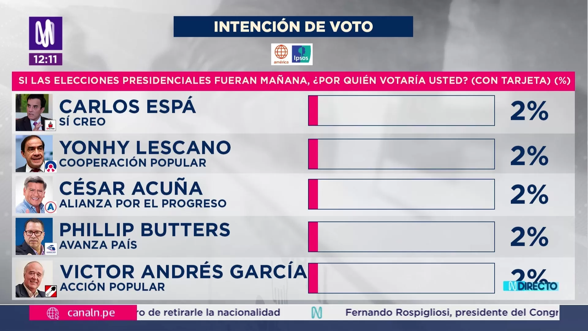 Con un 2% de apoyo aparecen el economista Alfonso López Chau (Ahora Nación), el abogado Carlos Espá (Sí Creo), el excongresista Yonhy Lescano (Acción Popular), el empresario César Acuña, y el conductor Phillip Butters (Avanza País).