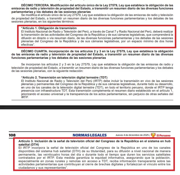 El Estado peruano exigirá al Instituto Nacional de Radio y Televisión del Perú (IRTP) transmitir de forma íntegra las sesiones del pleno del Congreso a partir del 1 de enero de 2026. La norma, aprobada por el Legislativo, dispone que uno de los canales de televisión digital terrestre (TDT) del sistema público emita en vivo las actividades parlamentarias.