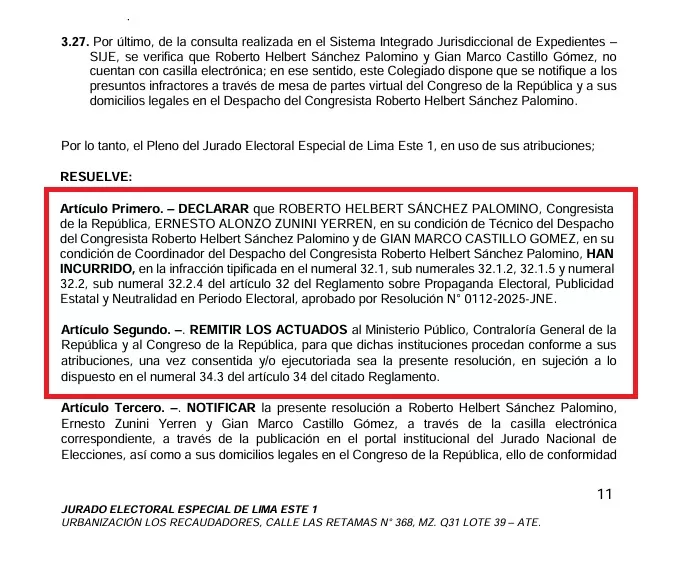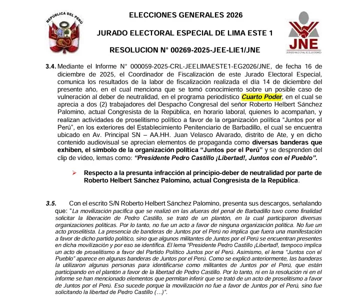 El Jurado Electoral Especial de Lima Este 1 determinó que el congresista Roberto Sánchez y dos trabajadores de su despacho infringieron el principio de neutralidad electoral durante las Elecciones Generales 2026. La decisión se basó en un informe de fiscalización sustentado en un reportaje de Cuarto Poder que documentó su participación en actividades proselitistas en los exteriores del penal de Barbadillo. El JEE rechazó los descargos presentados y ordenó remitir el expediente al Ministerio Público, la Contraloría y el Congreso para que procedan conforme a ley.