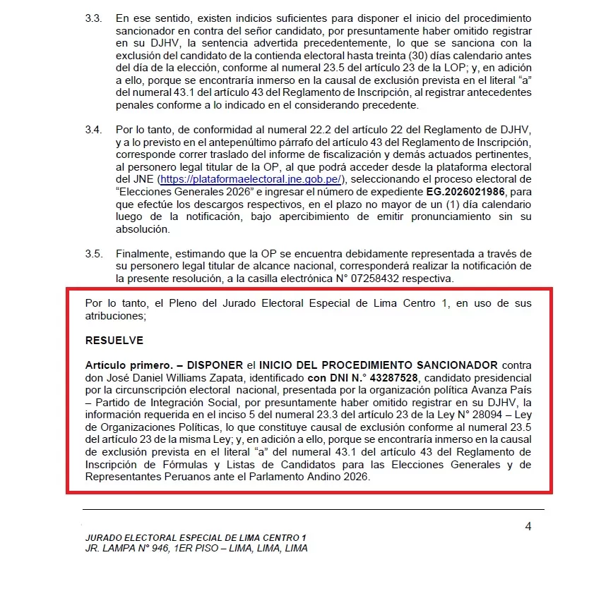 El Jurado Electoral Especial de Lima Centro 1 inició un procedimiento sancionador contra José Daniel Williams Zapata por presunta omisión de información en su Declaración Jurada de Hoja de Vida. La fiscalización detectó que no se habría consignado una referencia a un antecedente judicial vinculado a un delito doloso. El órgano electoral otorgó a Avanza País un plazo de un día para presentar descargos formales. La organización política solicitó el archivo del proceso y afirmó que no existe sentencia condenatoria firme. El JEE evaluará los argumentos y documentación presentados antes de emitir una decisión final.