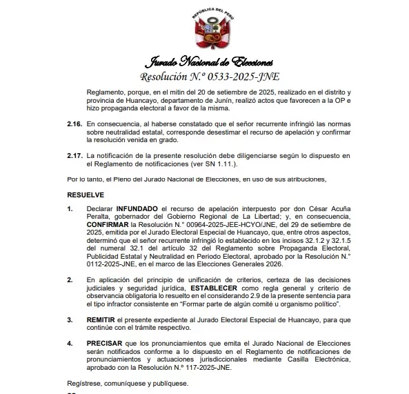El Jurado Nacional de Elecciones (JNE) declaró infundada la apelación presentada por César Acuña, gobernador regional de La Libertad, y confirmó la resolución del Jurado Electoral Especial de Huancayo que determinó la vulneración del principio de neutralidad electoral.