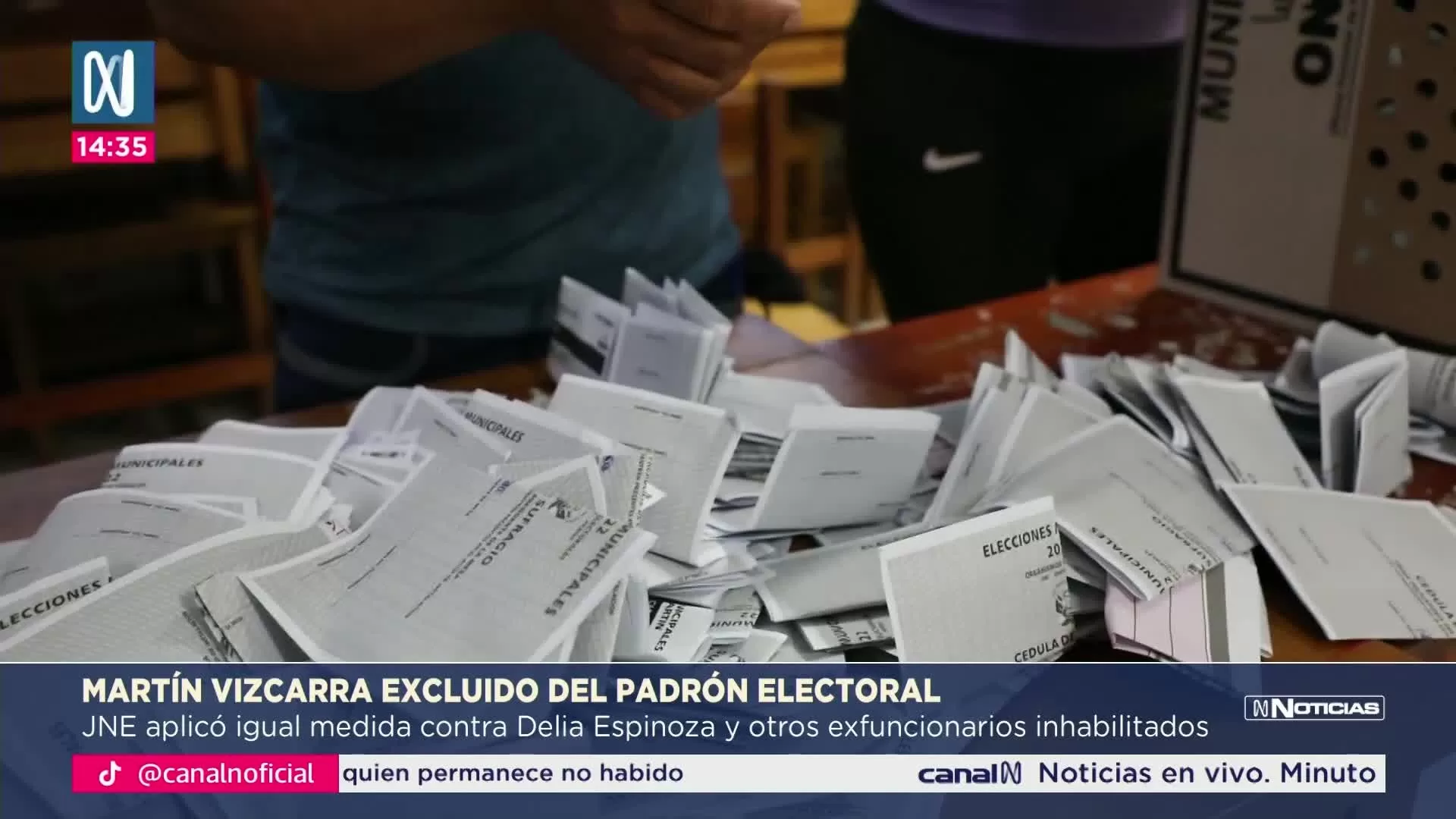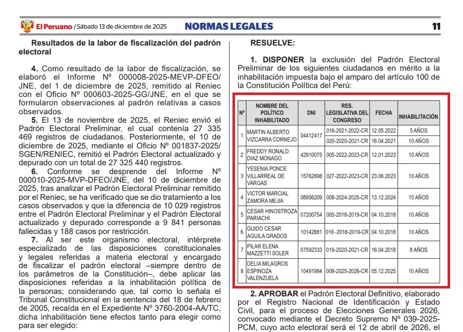 El Jurado Nacional de Elecciones (JNE) excluyó al expresidente Martín Vizcarra del padrón electoral para las elecciones generales convocadas para el 12 de abril de 2026. La decisión se formalizó mediante la Resolución N.º 0744-2025-JNE, publicada el 13 de diciembre en el diario oficial El Peruano, y obedece a las inhabilitaciones impuestas al exmandatario por el Congreso de la República.