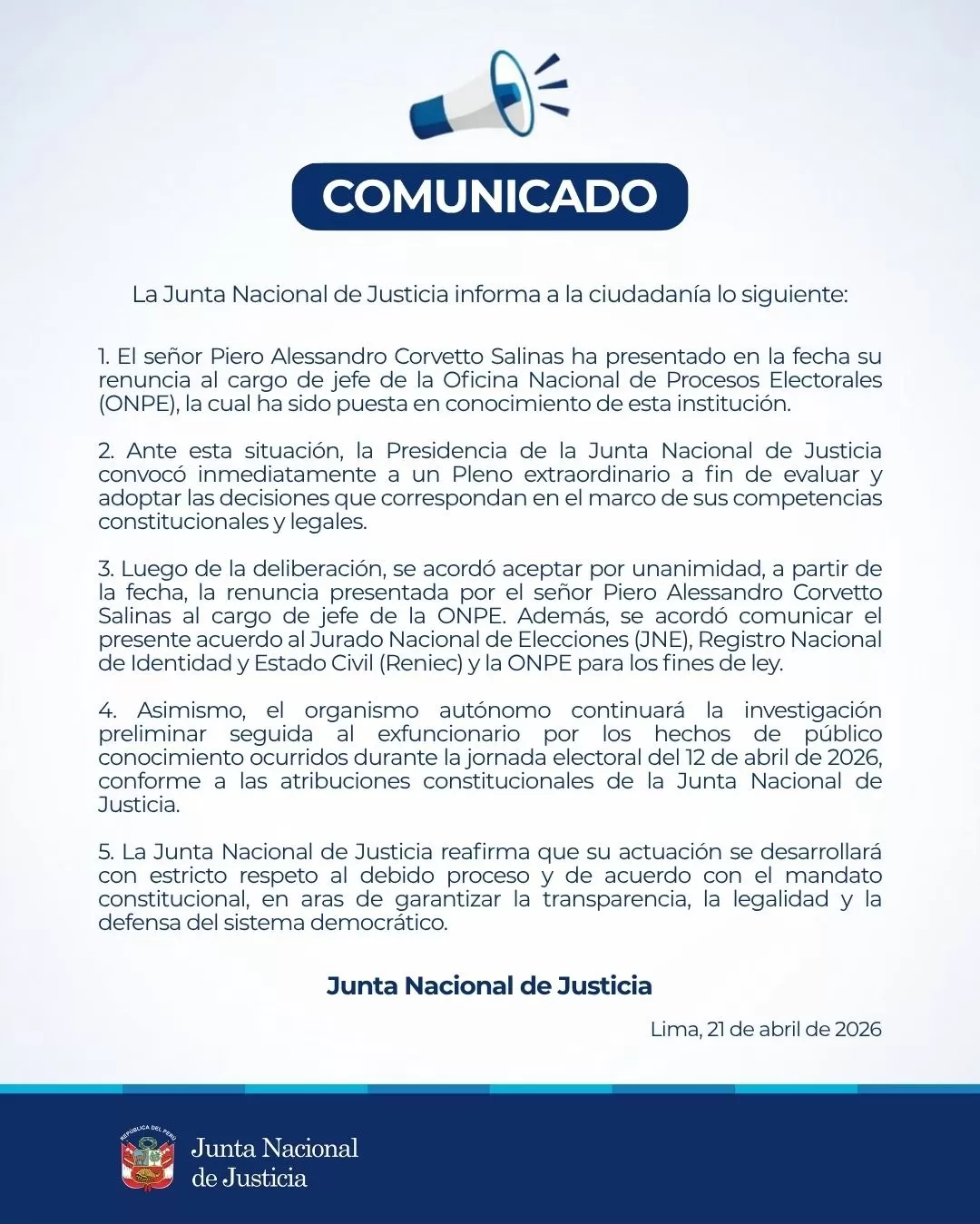 La Junta Nacional de Justicia (JNJ) aceptó por unanimidad la renuncia de Piero Corvetto Salinas al cargo de jefe de la Oficina Nacional de Procesos Electorales (ONPE), en medio de la crisis generada por las fallas registradas durante la jornada electoral del pasado 12 de abril.