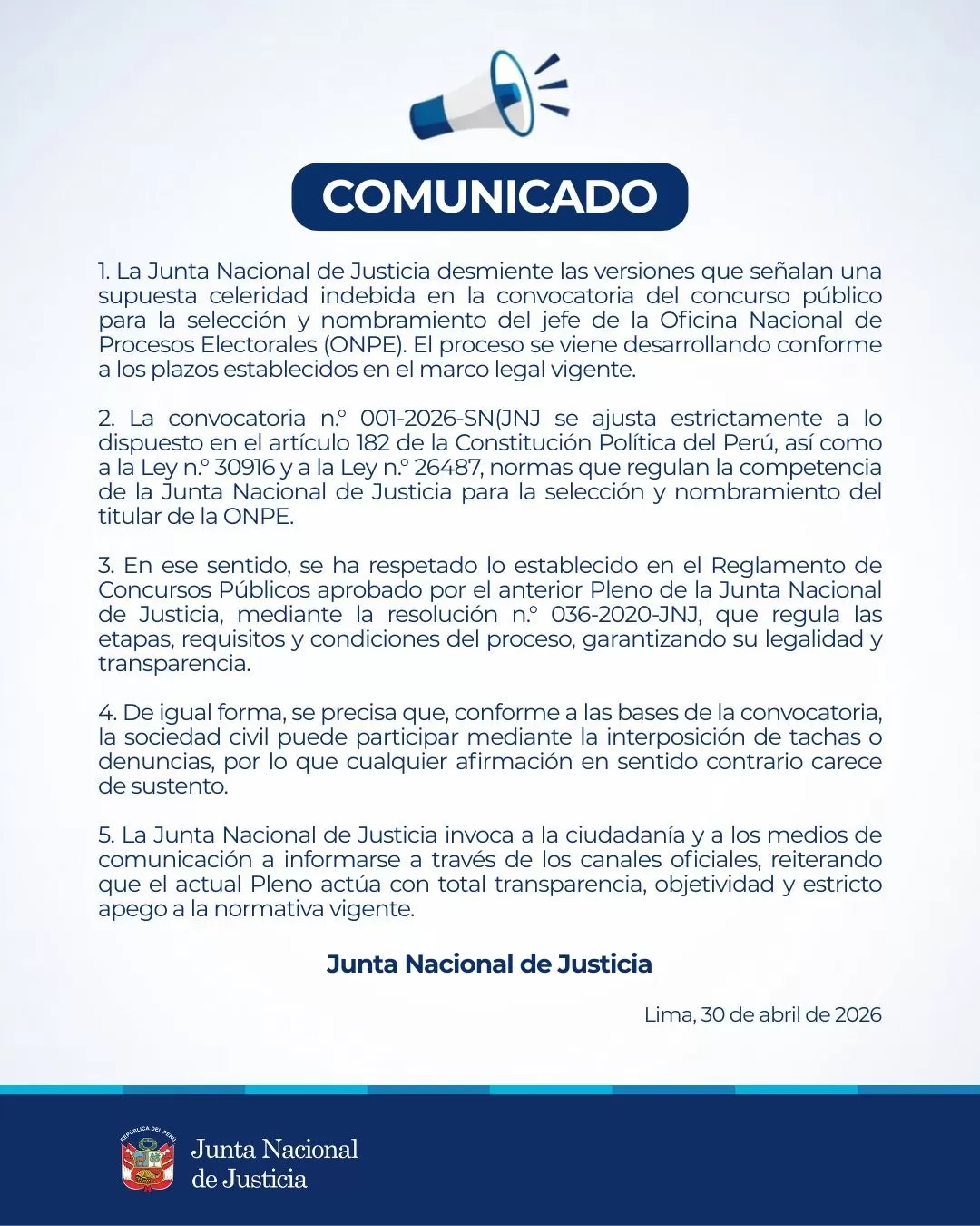La Junta Nacional de Justicia emitió un comunicado para responder a los cuestionamientos sobre una presunta aceleración irregular en la convocatoria del concurso público para elegir al nuevo jefe de la Oficina Nacional de Procesos Electorales.