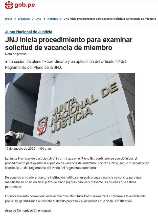 Según la institución, Ríos Patio dispone de cinco días hábiles para presentar sus descargos y pruebas en relación con la solicitud planteada. La JNJ aseguró que el trámite se desarrollará bajo el marco de la ley, con respeto al debido proceso y a las normas internas que rigen su funcionamiento.