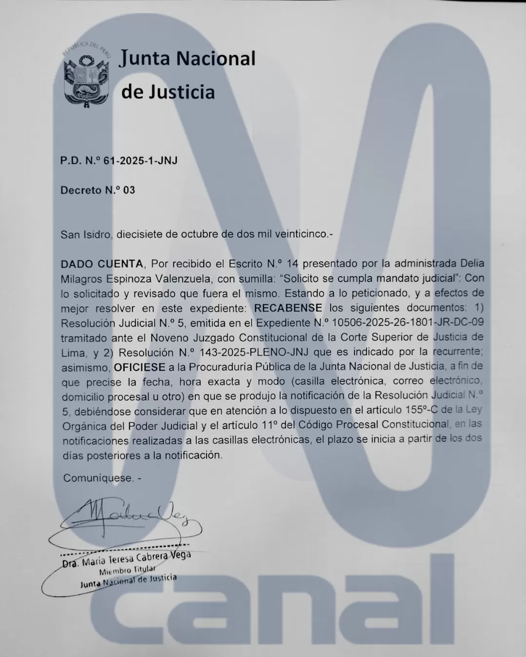El documento oficial al que accedió Canal N lleva la firma de la vicepresidenta de la Junta Nacional de Justicia, María Teresa Cabrera, y fue emitido el 17 de octubre de 2025. En él se dispone la recopilación de documentación clave y se solicita a la Procuraduría Pública de la entidad precisar la fecha y modo de notificación de la resolución judicial, en función del cómputo legal de los plazos establecidos.