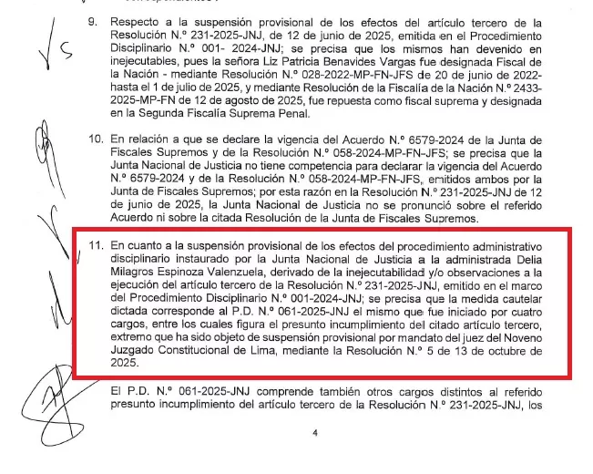 La JNJ acató parcialmente el mandato judicial al suspender dos de sus actuaciones previas: el artículo tercero de la Resolución N.º 231-2025-JNJ y el procedimiento disciplinario N.º 061-2025-JNJ, este último únicamente en lo relacionado con los cargos derivados de la defensa ejercida por Espinoza.