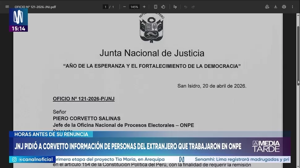 La Junta Nacional de Justicia (JNJ), a través de un oficio oficial, solicitó formalmente al jefe de la Oficina Nacional de Procesos Electorales (ONPE), Piero Corvetto -quien renunció este martes al cargo-, un informe pormenorizado sobre el personal de nacionalidad extranjera que presta servicios en dicha entidad. Este requerimiento se realiza en el marco de las competencias constitucionales de la Junta para supervisar el correcto funcionamiento de los organismos que integran el sistema electoral.