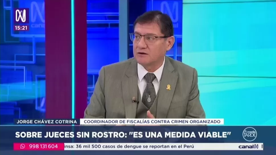 El coordinador de las Fiscalías contra el Crimen Organizado, Jorge Chávez Cotrina, señaló que implementar la figura de jueces sin rostro es una medida viable para enfrentar la criminalidad más violenta en el país. En entrevista con Canal N, sostuvo que esta propuesta podría evitar que jueces y fiscales sean recusados o amenazados por organizaciones criminales.