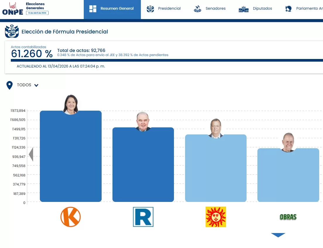 El documento oficial detalla que aún existe un 38.392% de actas pendientes de procesamiento en estas elecciones. Por delante de Nieto se encuentra Rafael López Aliaga con 1529613 votos, mientras que Keiko Fujimori lidera el conteo con 1873894 votos válidos obtenidos durante la jornada.