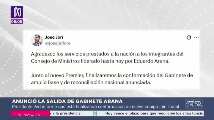 El presidente José Jerí anunció el término del Gabinete encabezado por Eduardo Arana, a solo tres días de asumir la jefatura del Estado. La decisión fue comunicada durante una reunión oficial en Palacio de Gobierno y a través de su cuenta en la red social X.