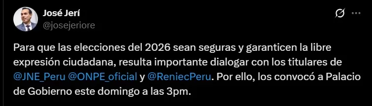 “Para que las elecciones del 2026 sean seguras y garanticen la libre expresión ciudadana, resulta importante dialogar con los titulares del JNE, Reniec y ONPE”, escribió Jerí.