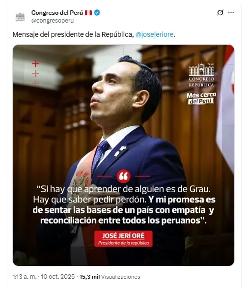 José Jerí asumió la Presidencia de la República minutos antes de la 1:00 de la madrugada de este viernes 10 de octubre, tras la vacancia de Dina Boluarte aprobada por el Congreso. En su primer mensaje al país, ofrecido desde el hemiciclo del Parlamento, el nuevo mandatario definió la seguridad ciudadana como el eje central de su gobierno transitorio y declaró la guerra a la delincuencia. Su discurso se extendió por aproximadamente diez minutos.