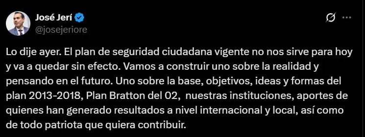 “El plan de seguridad ciudadana vigente no nos sirve para hoy y va a quedar sin efecto. Vamos a construir uno sobre la realidad y pensando en el futuro”, escribió Jerí.