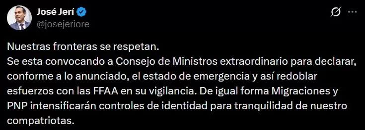 El presidente de la República, José Jerí, anunció este jueves la convocatoria a una sesión extraordinaria del gabinete para declarar el estado de emergencia en la frontera sur del país.