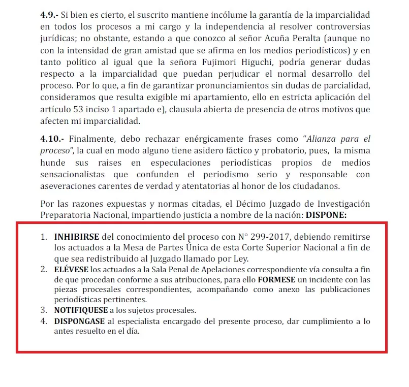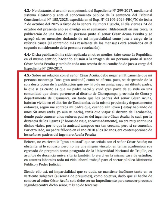 El magistrado explicó que, aunque mantiene su imparcialidad subjetiva, el vínculo familiar histórico entre su padre y el entorno de Acuña podría generar suspicacias.