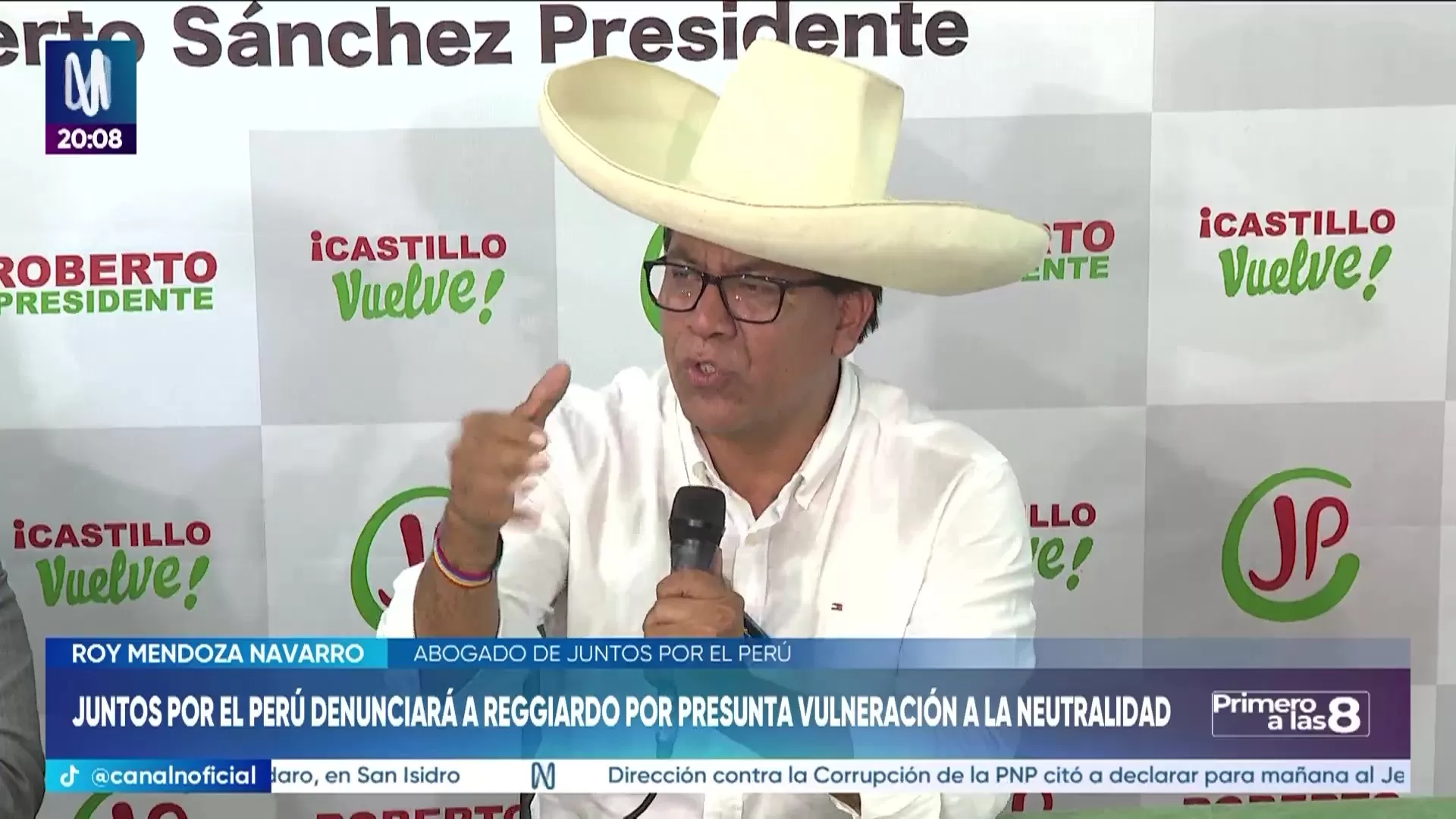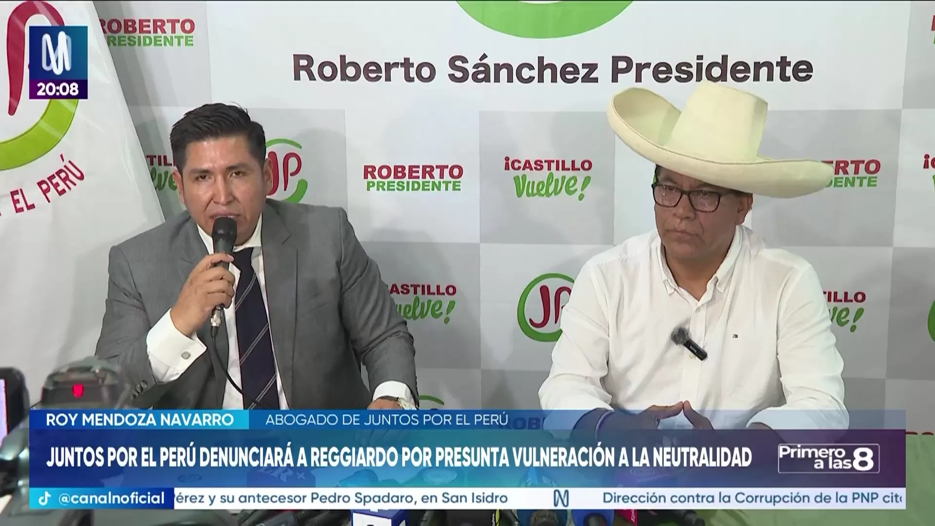 Juntos por el Perú anunció que interpondrá una denuncia contra el alcalde Renzo Reggiardo por presuntamente vulnerar la neutralidad electoral tras pedir la salida del jefe de la ONPE. El abogado Roy Mendoza confirmó que el recurso será presentado ante el Jurado Electoral Especial. Asimismo, el candidato Roberto Sánchez cuestionó el ofrecimiento de 20 mil soles de Rafael López Aliaga por información sobre fraude, calificándolo de presuntamente ilegal. La agrupación reforzó su equipo legal con abogados voluntarios para defender los votos en Cajamarca, donde Renovación Popular solicitó la nulidad de 98 mesas de sufragio.