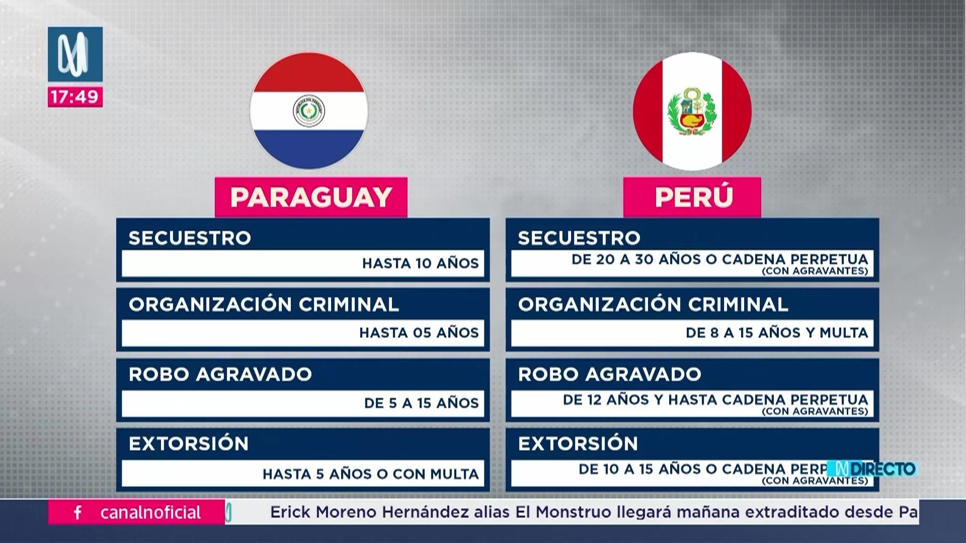 En el caso del secuestro agravado, el Perú contempla hasta cadena perpetua, mientras que en Paraguay la pena máxima es de 10 años. Por organización criminal, la pena es de hasta 5 años en Paraguay y entre 8 y 15 años en el Perú. Para robo agravado y extorsión, también existen diferencias sustanciales en la severidad de las sanciones.