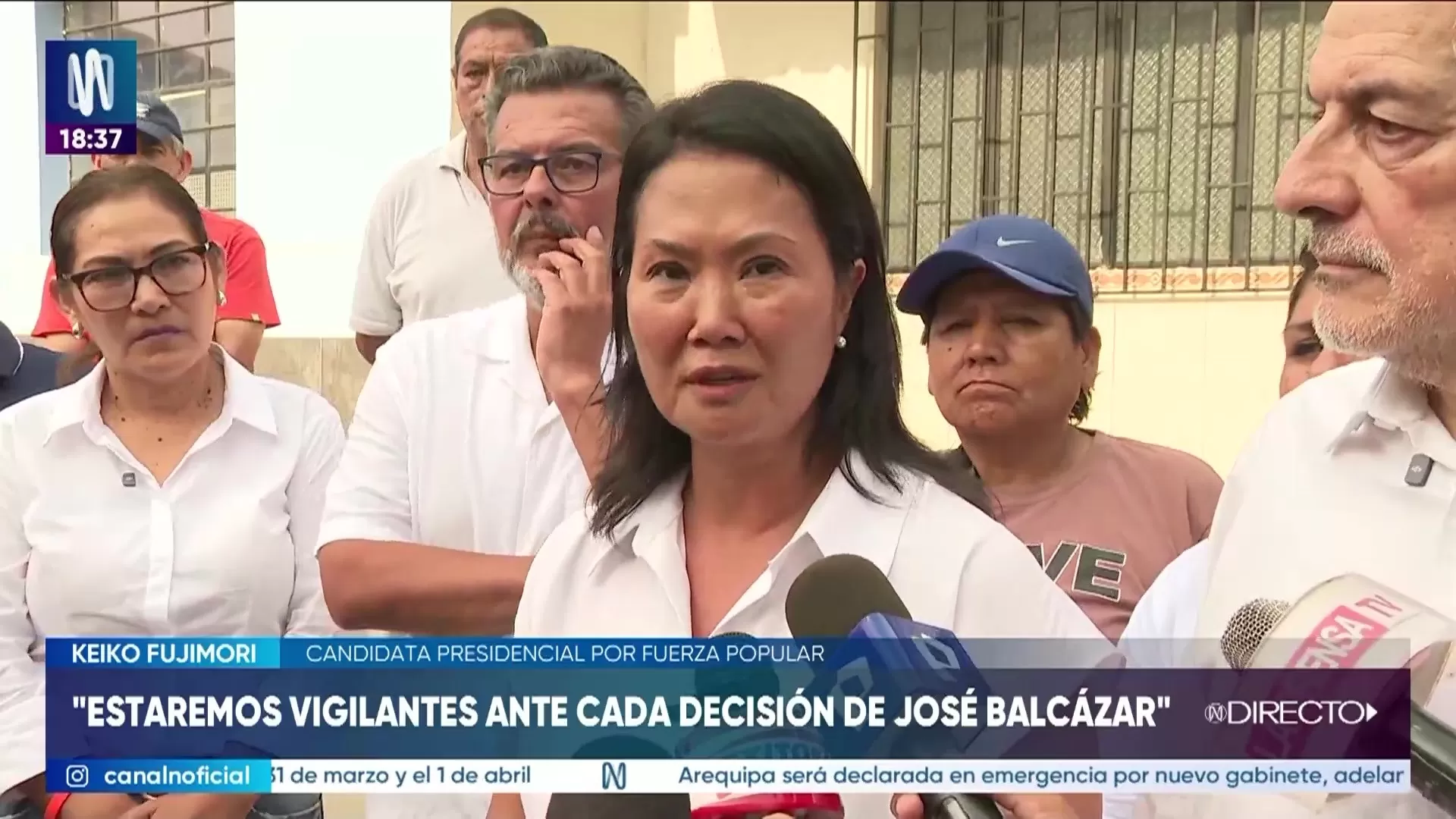 La candidata de Fuerza Popular, Keiko Fujimori, afirmó que su agrupación estará vigilante ante cada decisión que adopte el presidente José Balcázar. Señaló que el riesgo radica en una posible vulneración de la autonomía del Banco Central de Reserva, de la Constitución o del proceso electoral.
