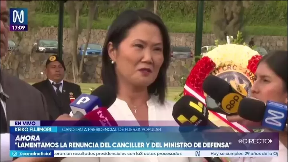 Fujimori lamentó la salida del canciller y del ministro de Defensa, destacando la trayectoria de ambos funcionarios de carrera. Sobre la controversia por la compra de aviones a Estados Unidos, enfatizó que los compromisos del Estado peruano se tienen que honrar para mantener la seriedad del país ante la comunidad internacional. "Es lamentable la imagen que estamos dando como país porque los compromisos se tienen que cumplir", sentenció la candidata.