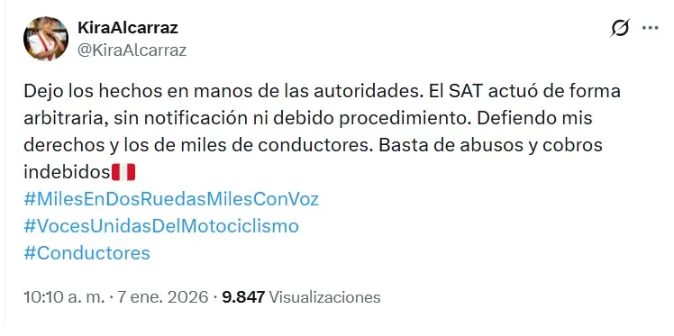 En su publicación, la parlamentaria afirmó: “El SAT actuó de forma arbitraria, sin notificación ni debido procedimiento”. Añadió que deja los hechos en manos de las autoridades y que continuará defendiendo sus derechos.