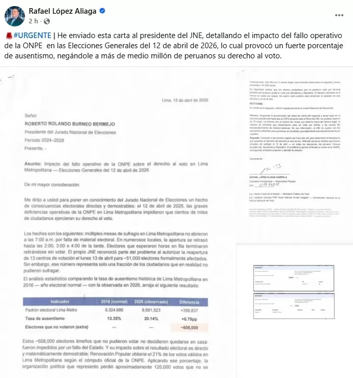 El petitorio de Rafael López Aliaga incluye dos puntos urgentes. Primero, suspender la proclamación de resultados por un plazo máximo de 72 horas para que la ONPE presente un informe detallado sobre el número de mesas que abrieron fuera del horario legal y las causas del desabastecimiento de material. Segundo, convocar a una reunión urgente del Pleno del JNE para determinar un mecanismo que garantice el derecho al voto de los 608,000 ciudadanos afectados.