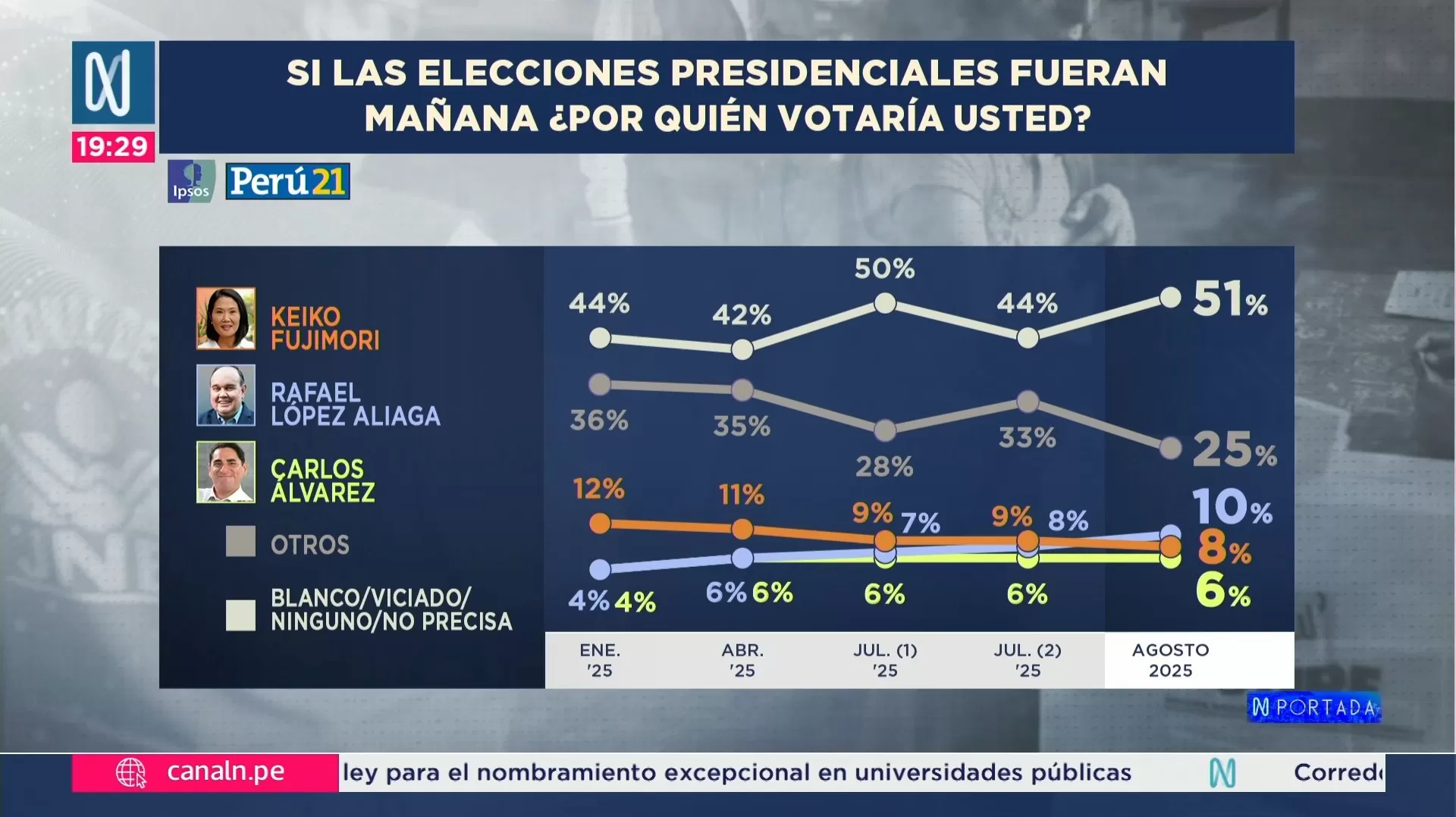 En contraste, otras candidaturas han perdido apoyo. “Keiko Fujimori estaba en 12 % y ahora está en 8 %”, precisó. A partir de ello, consideró que “es probable que parte del crecimiento de López Aliaga se deba a la caída de la lideresa de Fuerza Popular”.