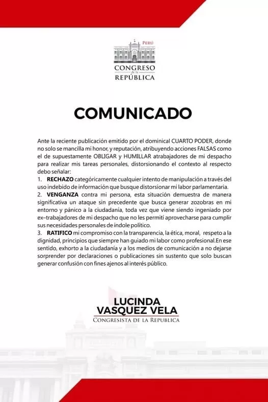 En un pronunciamiento público, Lucinda Vásquez afirmó que la denuncia responde a una “vendetta” por parte de ex trabajadores de su despacho. Según declaró, estas personas no habrían logrado aprovecharse del cargo para cumplir fines personales de índole político.