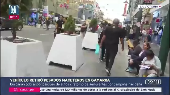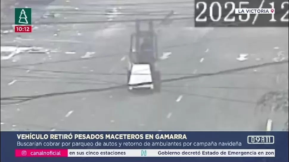 Siete maceteros de casi una tonelada fueron removidos en plena madrugada por un grupo de sujetos no identificados en el cruce de las calles Humbolt y América, en el corazón del emporio comercial de Gamarra, La Victoria. El hecho fue captado por cámaras de seguridad, donde se observa un montacargas trasladando los objetos sin que ninguna autoridad intervenga.