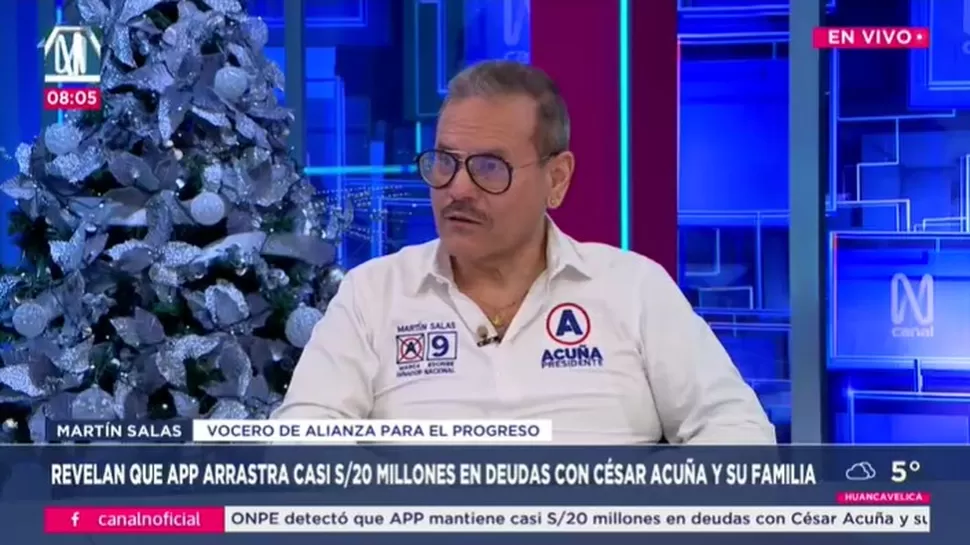 Martín Salas, vocero de Alianza para el Progreso (APP), se pronunció sobre el informe difundido por la ONPE que revela una deuda de 20 millones de soles del partido con la Universidad César Vallejo, de propiedad de su líder, César Acuña. En declaraciones a Canal N, Salas defendió la legalidad de los préstamos y negó que exista algún conflicto de interés.