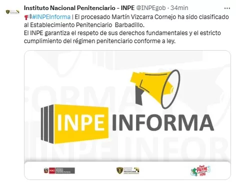 Tras el traslado, el Instituto Nacional Penitenciario (INPE) confirmó en un comunicado publicado en su cuenta oficial de la red social X que el exmandatario ha sido clasificado al Establecimiento Penitenciario Barbadillo.
