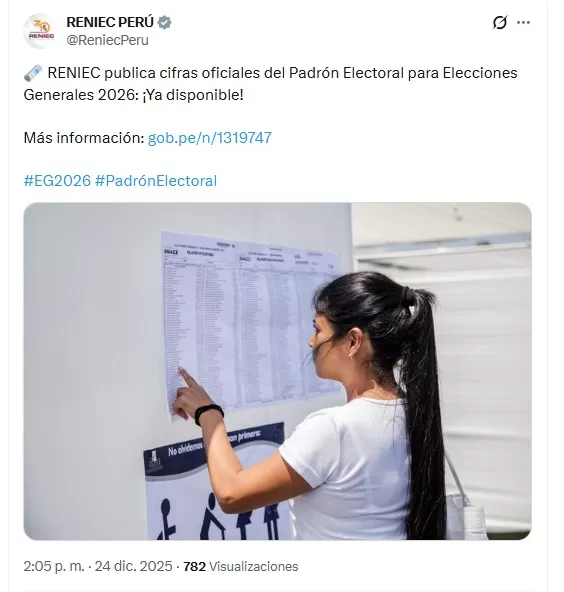 El Jurado Nacional de Elecciones (JNE) aprobó el padrón electoral oficial que será utilizado en las Elecciones 2026, estableciendo que 27 325 432 peruanos están habilitados para votar. El documento fue elaborado por el Registro Nacional de Identificación y Estado Civil (Reniec) y forma parte del cronograma electoral.