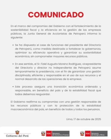 El comunicado ministerial señala que la transición será llevada a cabo de forma ordenada y responsable, garantizando el normal desarrollo de las actividades de Petroperú sin afectar sus compromisos ni su rol estratégico en el abastecimiento energético del país.