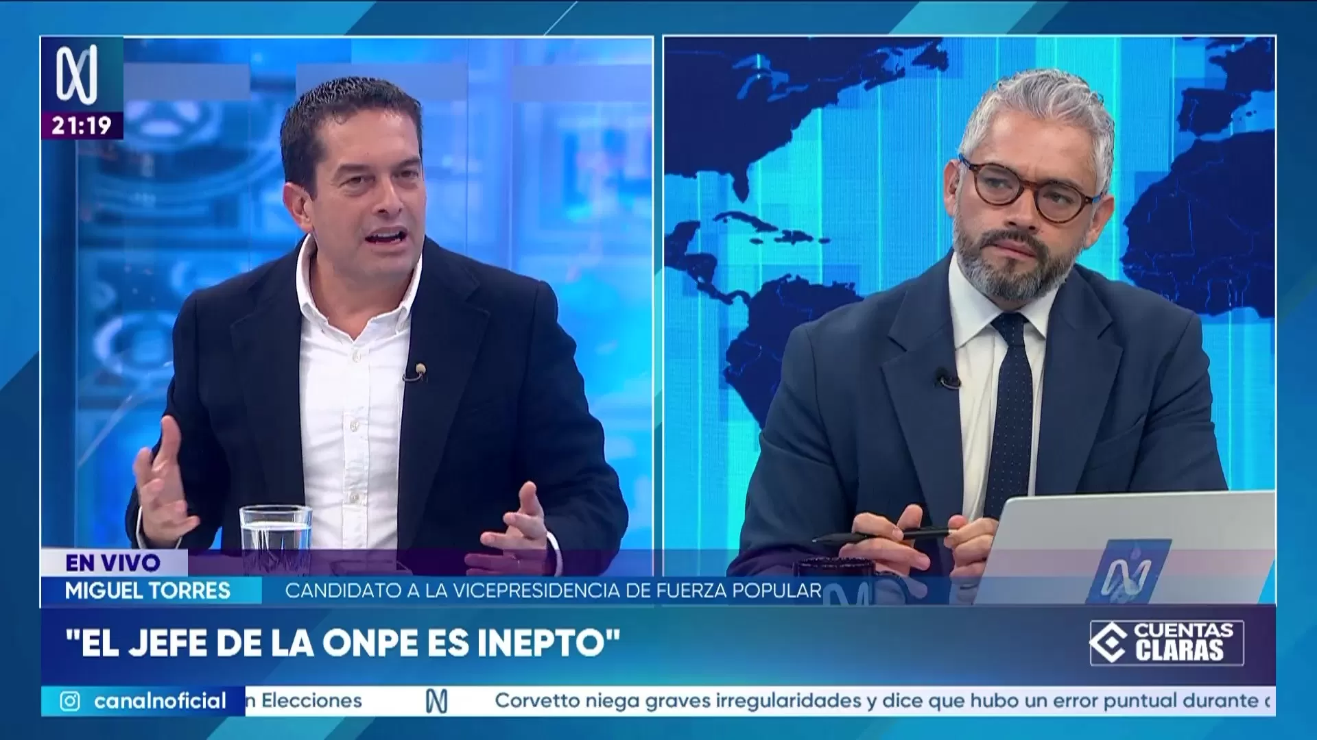 Miguel Torres, candidato a la vicepresidencia por Fuerza Popular, cuestionó el llamado a la insurgencia civil de Rafael López Aliaga. Torres calificó de irresponsable la actitud del líder de Renovación Popular y señaló que no existen pruebas de fraude. Asimismo, tildó de inepto al jefe de la ONPE, Piero Corvetto, por los retrasos en la instalación de mesas de votación el domingo 12 de abril. Torres respaldó la investigación de la Junta Nacional de Justicia y la denuncia penal del JNE contra funcionarios electorales, instando a respetar los canales democráticos legales para garantizar la transparencia en la segunda vuelta electoral.