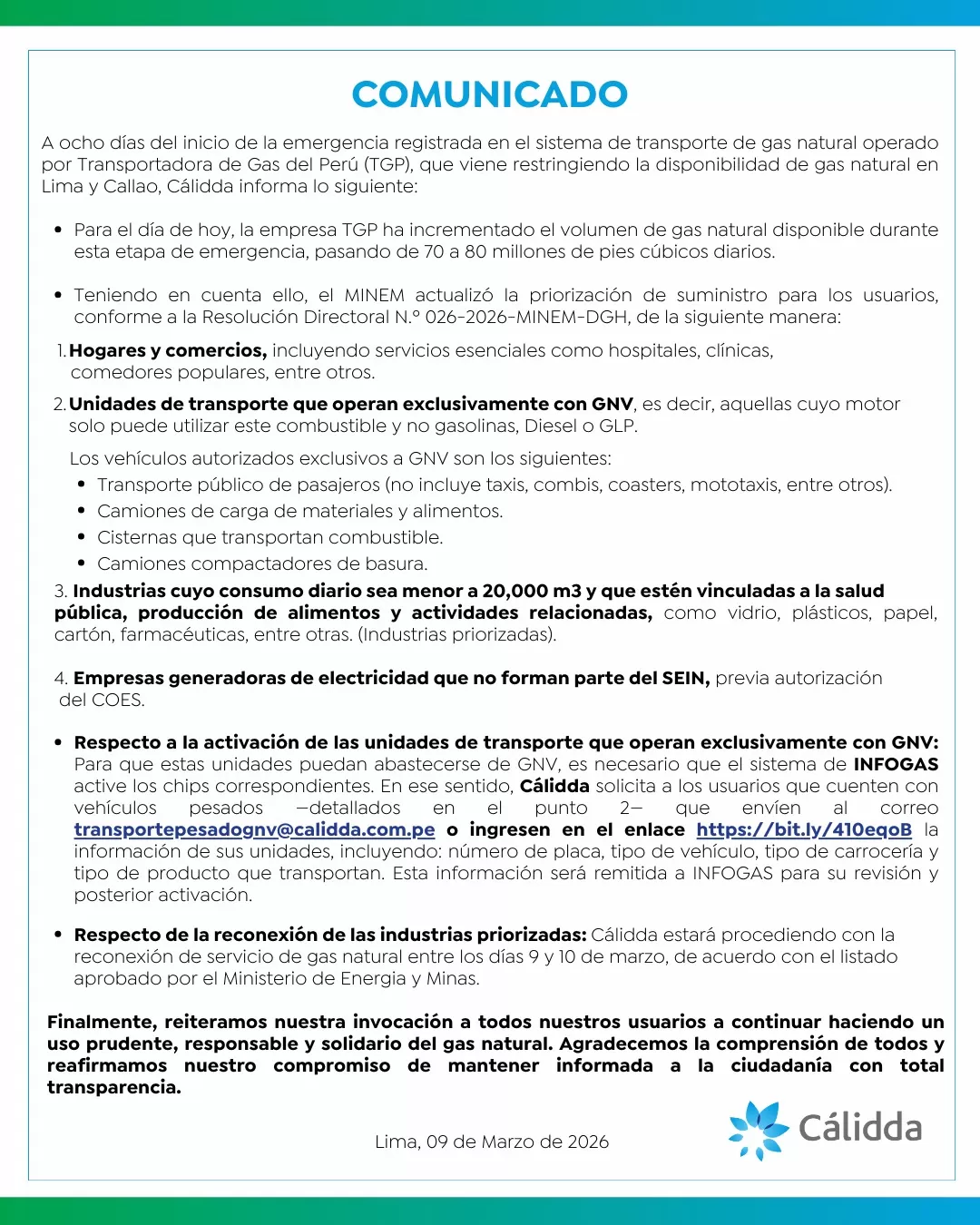 Cálidda indicó que la medida forma parte de las acciones adoptadas para administrar el suministro de gas natural mientras se desarrollan las labores relacionadas con la emergencia.