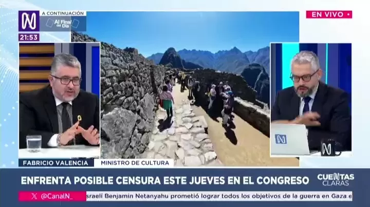 Fabricio Valencia, ministro de Cultura, declaró en Canal N que no presentará su renuncia antes de la moción de censura que el Congreso debatirá este jueves 9. Rechazó las críticas sobre su gestión en Machu Picchu y precisó que la crisis en la zona responde a competencias municipales. Reconoció la gravedad del conflicto y sostuvo que se han vendido más de 1.4 millones de boletos en lo que va del año. También aclaró que el título de “Maravilla del Mundo” otorgado a Machu Picchu no depende de Unesco, sino de una entidad privada sin tamiz técnico normativo internacional.