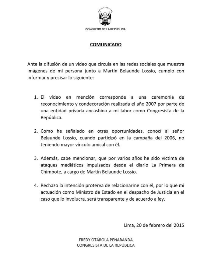 Otárola aseguró que solo lo conoció en la campaña electoral del 2006. "Por varios años he sido víctima de ataques mediáticos impulsados desde el diario La Primera de Chimbote, a cargo de Martín Belaunde Lossio", anotó.