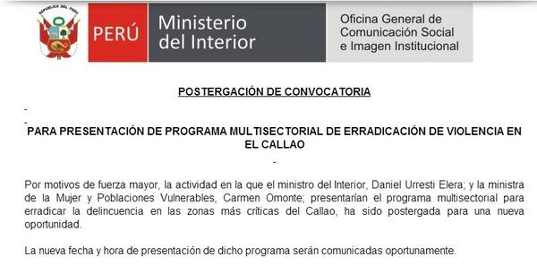 La actividad cancelada era la presentación de un programa para erradicar la violencia en el Callao, como se detalla en la nota de prensa enviada por el Ministerio del Interior.