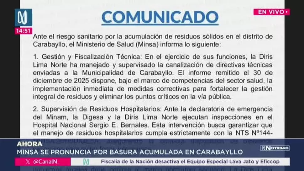 El Ministerio de Salud (Minsa) emitió un comunicado en el que advierte sobre el riesgo sanitario generado por la acumulación de basura en el distrito de Carabayllo. Según el informe remitido el 30 de diciembre de 2025 a la Municipalidad de Carabayllo, se dispone la implementación inmediata de medidas correctivas bajo el marco de competencias del sector Salud.