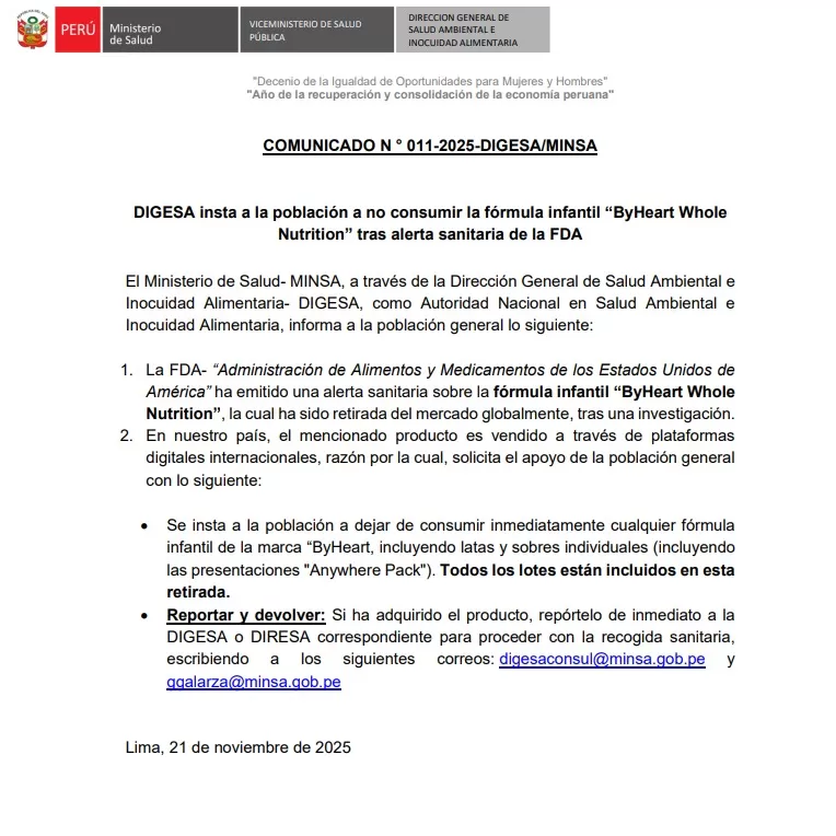 El Ministerio de Salud (Minsa) reiteró que la fórmula infantil ByHeart Whole Nutrition no es apta para el consumo y pidió a la población no adquirirla. La advertencia fue publicada a través de la Dirección General de Salud Ambiental e Inocuidad Alimentaria (Digesa), en el contexto de la alerta sanitaria internacional emitida por la Administración de Alimentos y Medicamentos de los Estados Unidos (FDA).