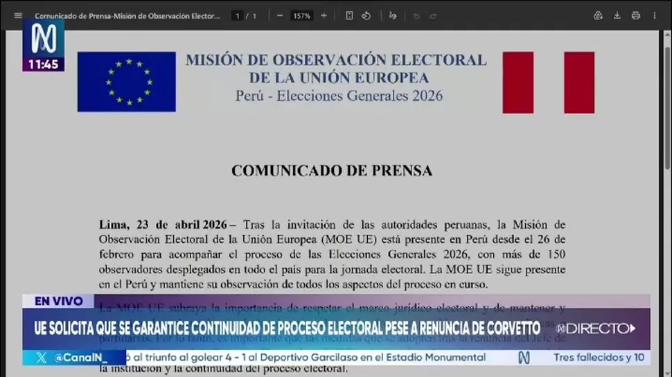 La misión reiteró su compromiso de acompañar el desarrollo de las elecciones en el Perú hasta su culminación, incluyendo eventuales etapas como la segunda vuelta, velando por el cumplimiento de estándares internacionales en materia electoral.