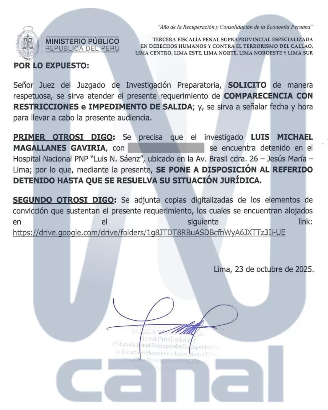 Según la disposición fiscal N.º 06, emitida el 23 de octubre de 2025, el investigado permanece detenido en el Hospital Nacional PNP "Luis N. Sáenz" y fue puesto a disposición de la autoridad judicial mientras se resuelve su situación jurídica.