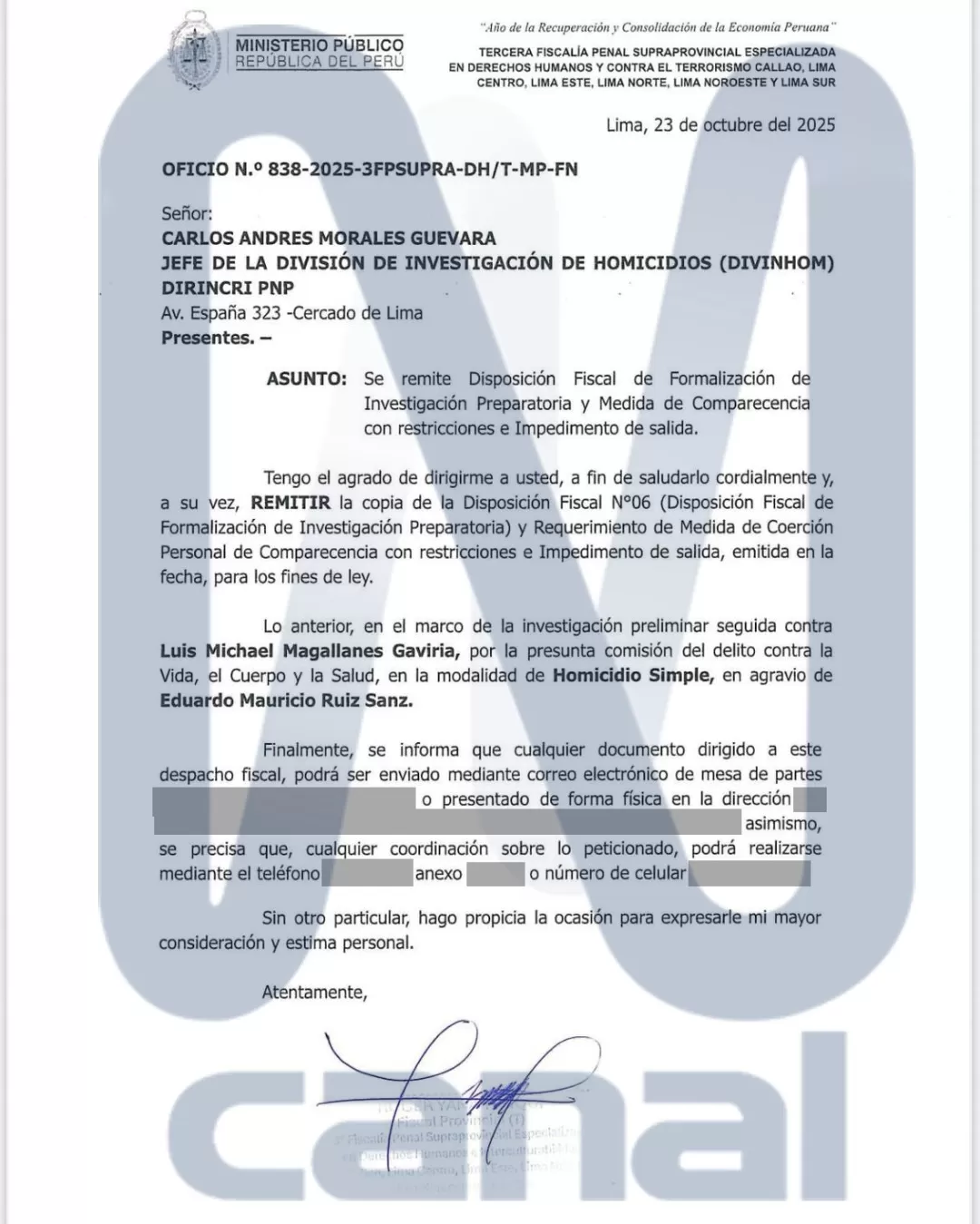 La solicitud fue formalmente remitida mediante oficio dirigido a la División de Investigación de Homicidios de la Policía Nacional, adjuntando la disposición de formalización y el requerimiento de medida de coerción personal.