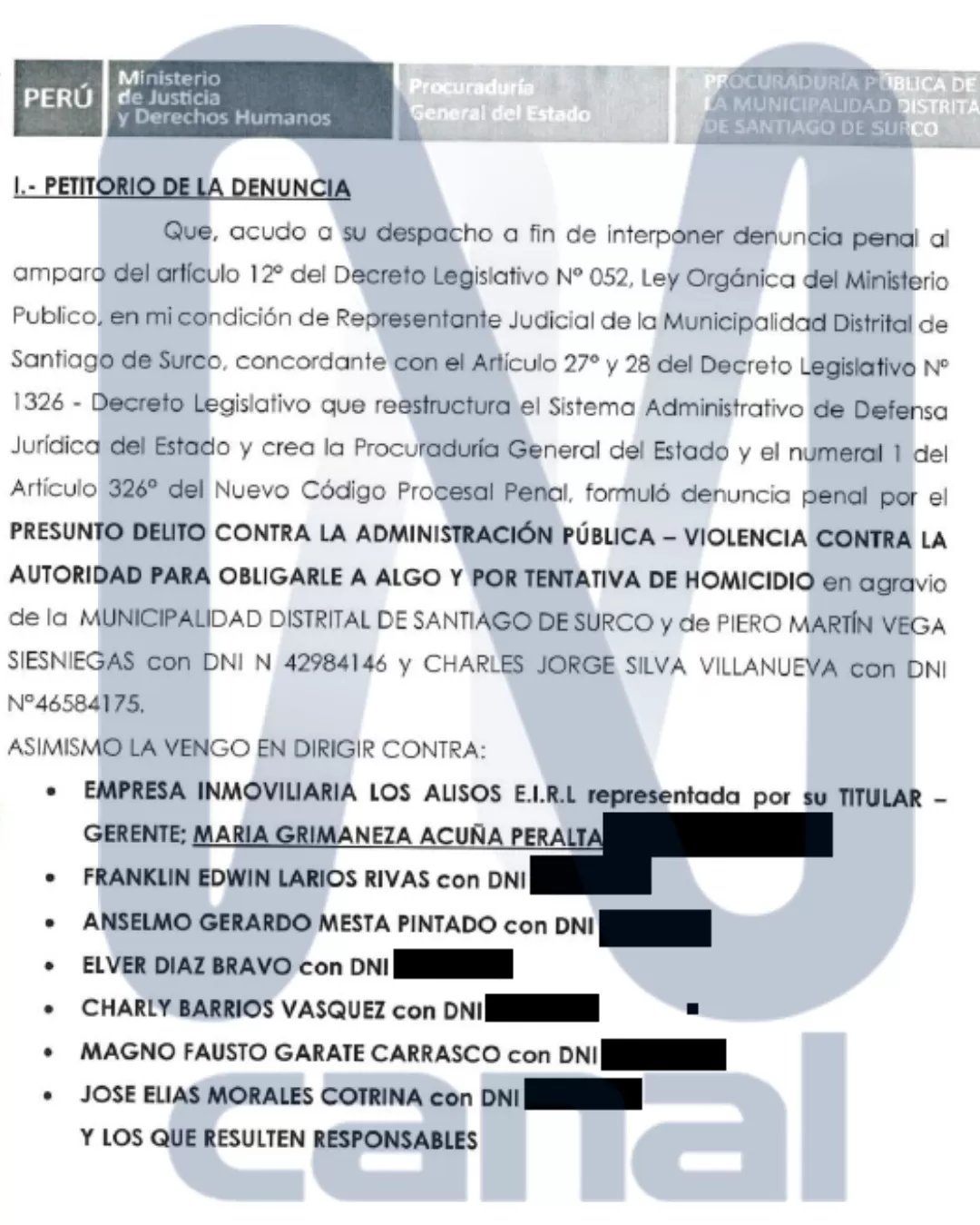 La acusación fue dirigida contra la empresa Inmobiliaria Los Alisos E.I.R.L. y su representante legal María Acuña, así como contra otras seis personas, incluyendo a José Elías Morales Cotrina, señalado por lanzar objetos pesados desde el tercer piso del inmueble.
